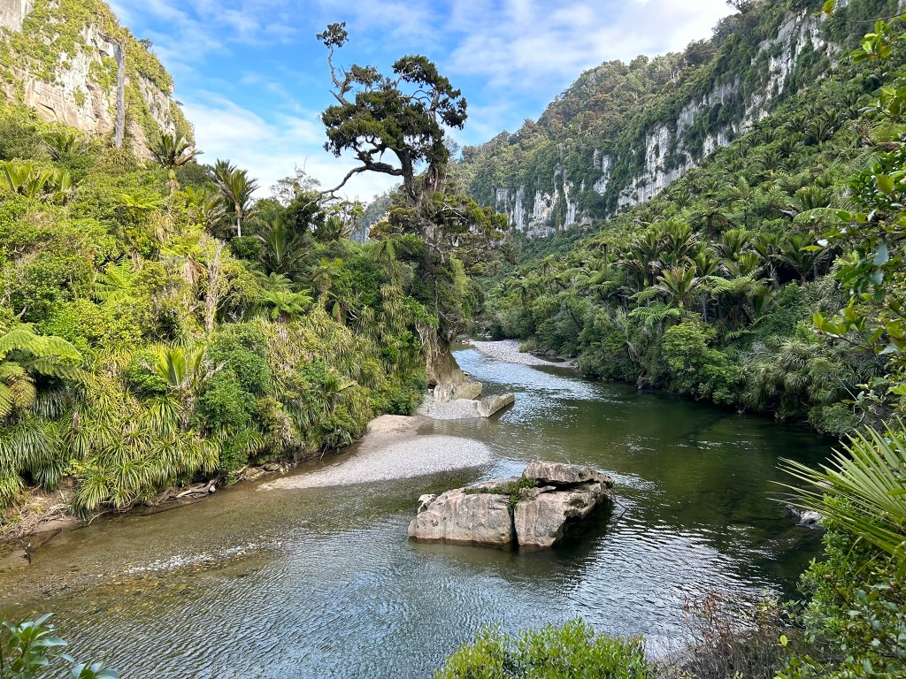 A few minutes drive from pancakes rocks is the Pororari River Track. This is a long out and back track where you can decide how far you want to go. The track runs alongside the river surrounded by white cliff, lush foliage and abundant bird life.